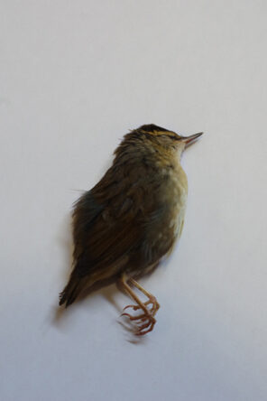 マミズクラゲがいないかなと思い、建物の外に設置されたウッドデッキに出てみる。水面に目を凝らすが、見つからない。館内に戻ろうとすると、緑がかった羽の小鳥が落ちて死んでいた。館の方に聞くと、「センダイムシクイですね」と教えてくださった。