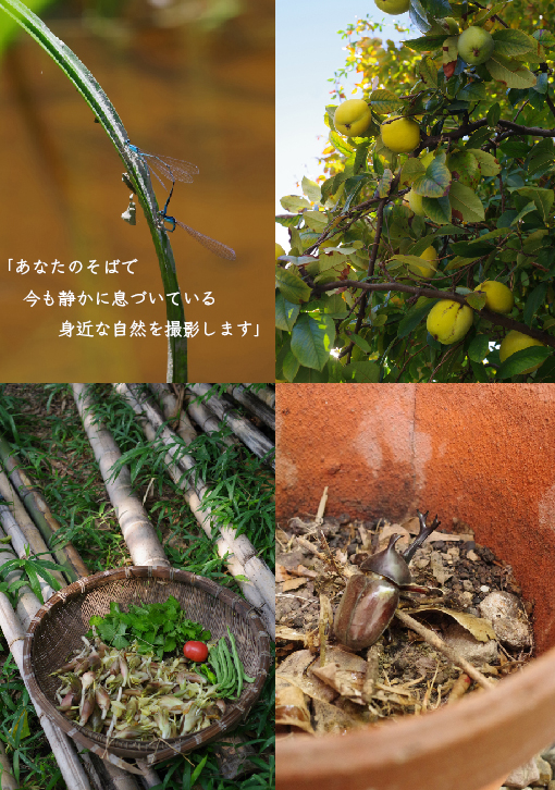 知多半島などで観察・撮影してきた経験を活かし、「身近な自然」の撮影依頼を承ります。内容は「四季を通じて、同じ場所の自然の様子を撮影し、身の回りの自然について知るためのお手伝いをする」というものです。