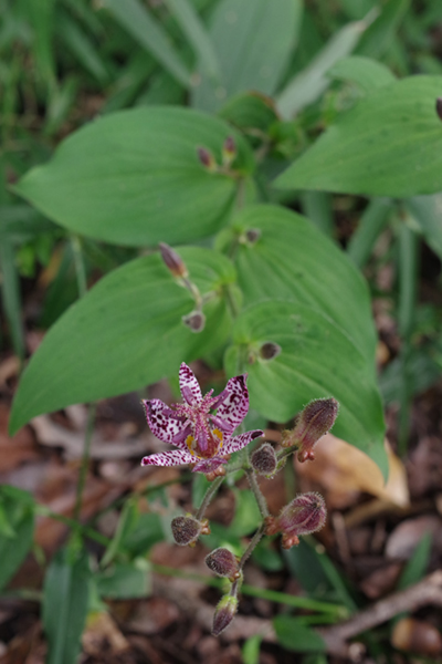 10月半ばに咲く、ホトトギスの花。和名の由来は、花の模様を、鳥のホトトギスの腹部に見立てたとされています。英名では、トード・リリー。ヒキガエルのユリという意味になります。